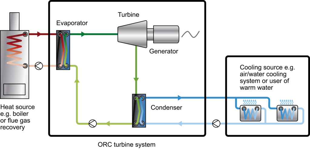 Den roterande turbinen driver sedan en generator som producerar elektricitet. Arbetsmediumet värms upp i förångaren med hjälp av hetvatten eller annan värmekälla över 80°C. Efter turbinen kyls gasen ner i systemets kondensor varpå värmen överförs till antingen ett fjärrvärmenät, lokalt värmenät eller kylkrets med kylfläktar eller kylvatten.